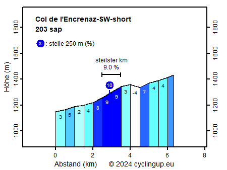Von den 2270 Höhenmetern wird ein beträchtlicher Teil (990 Meter) beim Aufstieg auf den Ramaz zurückgelegt, nur 280 Meter beim Aufstieg auf den Encrenaz und 750 Meter beim Aufstieg zum Joux Plane. Tatsächlich wird nur die zweite Hälfte des Aufstiegs auf den Encrenaz in dieser Route zurückgelegt. Daher ist dieser Anstieg viel leichter (203 Steigungsanstrengungspunkte (sap)) als die beiden anderen Anstiege (778 sap für den Ramaz und 617 sap für den Joux Plane). Weitere Informationen, einschließlich Profile, finden Sie hier für den Ramaz, hier für den Encrenaz und hier für den Joux Plane. Außerdem gibt es ein Profil des in dieser Route enthaltenen Teils des Encrenaz.