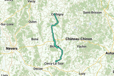 Route ab dem Gästehaus "Le Clos de Chitry" in Chitry-les-Mines, vollständig entlang des Canal de Nivernais, nahezu vollständig asphaltiert.
