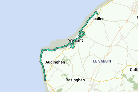 Vorläufige, geplante Route für die zweitägige Wanderung. Start in Escalles bei Cap Blanc Nez (Parkplatz), Camping in Wissant und Ende in Audresselles. Von dort mit dem Bus zurück nach Escalles. Tag 1: 10 km / Tag 2: 15 km.