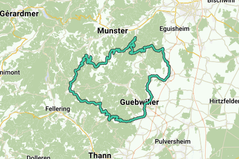 Fahrradroute für Rennräder von 100 km ab Gueberschwihr. Bei der Abfahrt direkte Steigung über D15 und D40 zum Col de Firstplan (Gipfel 720 m Höhe). Abfahrt über D40 und ruhige Steigung bis Wasserbourg über D43. Anspruchsvolle Steigung von Wasserbourg zum Petit Ballon (Gipfel 1149 m Höhe, im Durchschnitt 7,5%). Abfahrt bis nach Sondernach. Über D27 moderate Steigung zum Col de Platzerwasel (Gipfel 1155 m Höhe, im Durchschnitt 8,6% ab Sondernach). Weiter sanft hügelig zum Markstein (Gipfel 1184 m) über die D430. Ab Markstein 7 km über die D431 zum Grand Ballon (Gipfel 1343 m), wobei die ersten 5,5 km leicht hügelig und die letzten 1,5 km ziemlich steil sind.