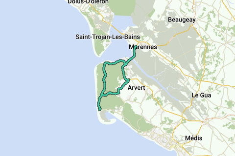 Abfahrt von Marennes. Route durch den Wald von Coubre, vorbei an Ronce les Bains, dem Leuchtturm von Coubre und dann Rückkehr über Dirée. Fahren Sie an allen Stränden der rauen Küste vorbei.