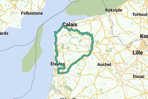 Route von Montreuil sur Mer rund um den Regionalen Naturpark der Côte d'Opale. Mit schönen Sträßchen entlang der Sümpfe und der Küste. Viel Fahrvergnügen!
