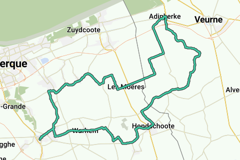 Start auf dem Platz bei der Sint-Audomarus-Kirche (V) in Adinkerke. Hier kann es voll werden, denn Plopsaland liegt gleich weiter. Genauso wie der Bahnhof (Fahrradverleih), Endpunkt der Linie Gent-De Panne. Wählen Sie am besten einen windstillen Tag für diese Tour nach Flandern, unter anderem durch die offene Fläche von De Moeren. Halten Sie die Kirche und den Platz mit unter anderem einem Informationspanel des Fahrradroutennetzes links und biegen Sie rechts ab, zur Brücke über den Kanal Veurne-Duinkerke. Folgen Sie dem Radweg in Richtung E40/A18 Calais-Ostende und fahren Sie an der rotierenden Kreuzung mit dem Segelwagen geradeaus. Über die Autobahn endet der Radweg. Folgen Sie den Schildern der Cobergherroute und dem Radnetz Westhoek Noord bis zum Knotenpunkt 10, weiter geradeaus in die Cappoenstraat und vorbei am Moerhof mit der Kapelle, die sich zwischen den Gräben windet. Mit links die Türme von Veurne folgen Sie einfach den Schildern. Rechts kommen die Sint-Karelsmolen 1 und ein NATO-Sendemast 2 in Sicht. An einer T-Kreuzung, mit dem flügellosen SintGustaafsmolen direkt vor Ihnen, zeigt in dieser Cromfortstraat die Cobergherroute nach rechts. Sie gehen nach links in Richtung Bulskamp und Veurne, immer zu Knotenpunkt 10. Sie nähern sich Bulskamp, mit Knotenpunkt 10 auf der Brücke über die Bergenvaart, die Sie in Bergues wieder als Canal de la Basse Colme sehen. Über die Brücke rechts ab, zu Punkt 12. Kurz vor Bulskamp ignorieren Sie die Schilder zu 12 und 13 und biegen Sie in der Beauvoordestraat rechts ab zu Punkt 25, Beauvoorde und Houtem. Bleiben Sie in Richtung 25, zuerst rechts und dann weiter links in die Karreweg, zwischen Feldern und Höfen hindurch, zu einer Steinformation. Geradeaus und dann gleich schräg rechts in die Sikkelstraat, in Richtung Houtem (4 km). Dieser Asphaltweg steigt zu Knotenpunkt 25 mit einem Picknickplatz an. An dieser Kreuzung rechts ab, in Richtung Punkt 24, nach Houtem. Weiter folgen, weiter nach rechts und bei der folgenden T-Kreuzung links, jetzt in der Moeresteenweg. In Houtem an der T-Kreuzung links ab in die Sacramentstraat, 2 km von der französischen Grenze und Hondschoote, zu Punkt 24. Durch die Dorpsstraat, wo Sie einen Platz in Richtung Kirche und Café De Welkom passiert und sofort Punkt 24 rechts liegen lassen. De Witte Torre von Hondschoote geradeaus in der Westmolenstraat. An dem Dreieck außerhalb des Dorfes biegen Sie nicht nach Hondschoote ab, sondern fahren geradeaus in die schmalere Molenwalstraat und ein Stück weiter links in die schmale Heidenstraat, in Richtung Punkt 40. Vorbei an einer Bushaltestelle und einer Bank (mit dem Sendemast fast an der Grenze zu Les Moëres) geht es in Richtung 40 links in die Doornstraat. Sie folgen geradeaus der Driekoningenstraat, entlang der Cobergher-Fahrradroute und etwas weiter entlang einem zweisprachigen Schild der Blauwers- und Commiezenroute. Bei ein paar Höfen überqueren Sie die Grenze und den Hoofdgracht. Der hohe Kirchturm von Hondschoote (die Witte Torre im Volksmund) wird immer deutlicher sichtbar. An der nächsten Kreuzung nehmen Sie links die Rue Coppens, vorbei an der Noordmeulen 3 bis ins Zentrum von Hondschoote, mit seinem fotogenen Dorfplatz mit der Kirche, dem Rathaus und der Kiosk. Bleiben Sie noch eine ganze Weile auf der Cobergerroute: die D55 oder Rue de la Libération in, in Richtung Bergues und Autobahn. Nach den Verkehrsampeln schräg rechts in den Chemin des Anguilles, durch die Felder zu einer T-Kreuzung. Kurz diese Hauptstraße nach rechts und dann rechts in die schmale Drève des Foins. Von einer T zur anderen, aus dem Chemin des Moëres auf eine größere Straße. Nach rechts, bis die Cobergherroute nach etwa 500 m an einem Dreieck nach rechts abbiegt. Dort fahren Sie geradeaus in die enge Smeerstraete, parallel zur Route Blauwers und Commiezen. Folgen Sie den Schildern, kurz in die Haeghe Meulenstraat und dann rechts rein, auf das Gebiet von Warhem. 100 m weiter geht es in der Smeerstraete geradeaus und Sie folgen links der Steenweg. Immer geradeaus, Richtung Kirchturm von Warhem, weiter in die Rue de l’Est, vorbei an einem Ferienpark. Der flämische Charme von Bergues In Warhem biegen Sie bei der Kirche kurz nach rechts ab und dann gleich links rein. Immer weiter folgen, vorbei am Friedhof, bis zu einem größeren Kreuzungspunkt. Sie kommen aus dem Chemin de la Croix und überqueren zur Rue de Warhem. Dies ist das Gebiet von Hoymille, der Randgemeinde von Bergues. Durch eine KMO-Zone kommen Sie zu einem Kreuzungspunkt. Hier rechts rein, durch eine Zone 30 mit neuem Wohnbau, bis Sie auf eine verkehrsreichere Straße entlang eines Kanals gelangen. Überqueren Sie vorsichtig und folgen Sie diesem Canal de la Basse Colme nach links. Nach etwa 500 m fahren Sie in der umgebenen Stadt Bergues über die Porte d’Hondschoote, neben einem Campingplatz. Genießen Sie die Vauban-Website 4 rechts und den Blick auf die Kanäle in 'dem anderen Brugge in Flandern'. Biegen Sie links auf die D3 zur 'Centre Ville' ab, durch eine Einkaufsstraße zum Place de la République. Unten im Belfried, dessen Turm Sie besteigen können, finden Sie den Tourismusdienst (und Toiletten) und weiter auf dem Markt das Rathaus, Geschäfte und Gastronomie. Nehmen Sie sich Zeit, um diese charmante Stadt zu erkunden. Und fahren Sie dann auf demselben Weg wieder aus der Stadt hinaus, in Richtung Téteghem. Vorbei an Hoymille überqueren Sie die Brücke über den Kanal, in der Route des Neiges. Folgen Sie dieser breiteren Straße etwa 2 Kilometer, bis Sie schräg links und dann geradeaus eine schmalere Abzweigung zwischen tiefen Gräben nehmen können. Hinter diesen riesigen Ebenen liegt links die Industrie von Dunkerque. Aus diesem Chemin des Neiges erreichen Sie an einer Kreuzung mit einigen Unternehmen. Rechts auf dem Radweg, in Richtung Uxem und weiter folgen. Über die D2 oder Route d’Uxem gelangen Sie, unter anderem über das Canal des Moëres, schließlich ins Dorf selbst. Dort