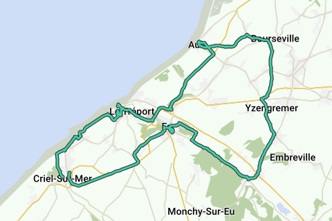 Van Criel entlang der Küste bis nach Ault, dann nach Bourse, Yzengremer, Beachamps (baie de Somme) und zurück über Eu, Etalondes nach Criel