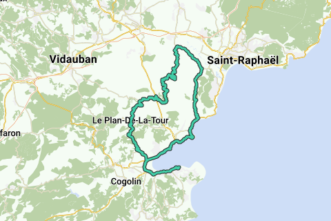 Diese Route beginnt am Place des Lices in Saint Tropez. Über den Radweg entlang der D98A und der D559 wird der erste Anstieg auf der D244 in Richtung Plan de La Tour bewältigt. Von hier spielt sich die Route im "Forêt Domaniale des Maures" ab. Eine sanfte Landschaft verwandelt sich nach dem Überqueren der D25 in eine sehr steile Steigung (Col de Pelgros, >16%). Die folgende schmale Straße führt nach Roquebrune sur Argens. Die lange Abfahrt ist nicht steil (max. 4%), aber besondere Vorsicht ist aufgrund von Kieselsteinen und etwas Sand geboten. Also, Vorsicht hier! Über die D7 und die D8 (mit einem letzten Anstieg) gelangt man zur D559 entlang des Mittelmeers. Bis kurz hinter Sainte Maxime fährt man auf der Straße, danach gibt es einen Radweg bis nach Saint Tropez.