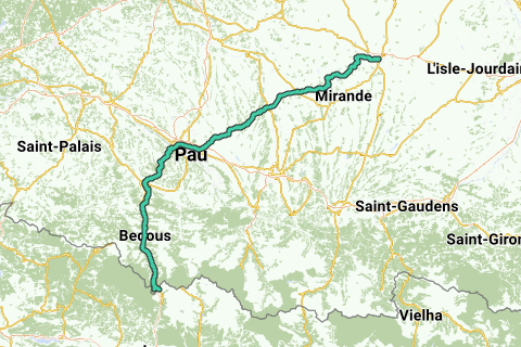 Rennrad-Variante der letzten Etappe des Saint-James-Pilgerwanderwegs Via Tolosana, der von Auch zum Somportpass führt, Pau passiert und die Grenze nach Spanien überquert, wo er mit dem Camino-Netzwerk verbunden ist, das nach Santiago de Compostela führt.
