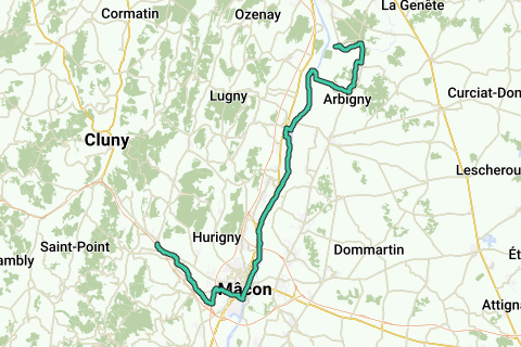 Radfreundlicher Weg über den Radweg entlang der Saône bis nach Mâcon. Danach über den Radweg durch Weinberge nach La Roche Vineuse.