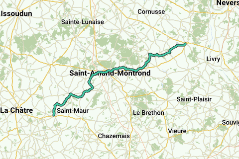 Durch die Stadt und über die Brücke über die Cher – Orval – D925 – an der Runde geradeaus – 2. Straße links – D112 – Orcenais – an der Gabelung links – la Greugne – Bouffeloux – links ab – an der Gabelung rechts – D138 – Loye-sur-Arnon – rechts ab auf D951 – entlang Ardenais – an der Kreuzung links D38 – Les Moricots – Montalon – an der Gabelung rechts – La Bourgoisie – an der Kreuzung rechts – le Taillet – an der Gabelung links auf D951 – le Châtelet – Les Archers – La Preugne – in Richtung St. Jeanvrin – kurz davor rechts (neben dem Friedhof) – Beddes – über D70 – Châteaumeillant