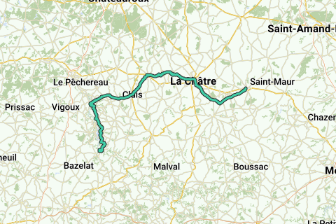 Über D38 – Mouhers – Cluis – D38 – Halle – la Suzelle – Villeginais – D38 – La Grange – les Chocats – D40 – Gargilesse-Dampierre – Cuzion – Bonnu – D40a – entlang Fougères – Les Bordes – St. Jallet (D30) – Crozant