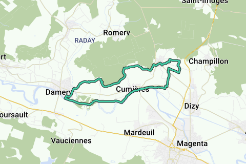 Diese Wanderung führt dich durch die wunderschönen Weinberge zwischen Hautvillers und Damery, am Rande des Naturparks Montagne de Reims. Die Route beginnt in der Nähe der Abtei von Hautvillers und verläuft in westlicher Richtung zum Dorf Damery. Der Rückweg erfolgt entlang der Ufer der Marne. Unterwegs passierst du das Dorf Cumières. Die Strecke ist insgesamt 15,5 km lang.