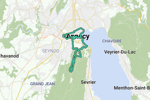 Diese Route beginnt am Bahnhof von Annecy. Die Route verläuft entlang der Ufer des Thiou bis ins Zentrum. Danach geht es in südlicher Richtung durch die Wälder. Im Wald passierst du eine Aussichtsplattform, von der du einen beeindruckenden Panoramablick auf Annecy hast. Jetzt musst du zurück zum Annecy-See absteigen. Du wanderst entlang der Ufer dieses wunderschönen Sees zurück nach Annecy. Die Route führt dann an einigen Sehenswürdigkeiten und Parks in der Stadt vorbei und kehrt danach zum Bahnhof zurück. Die Länge beträgt 15 km.