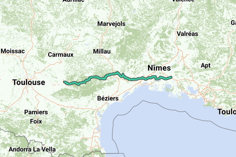 Es ist eine schöne Fahrradroute von Arles in der Camargue über Toulouse zum Col du Somport an der französisch-spanischen Grenze. Gesamte Entfernung: ca. 700 km.