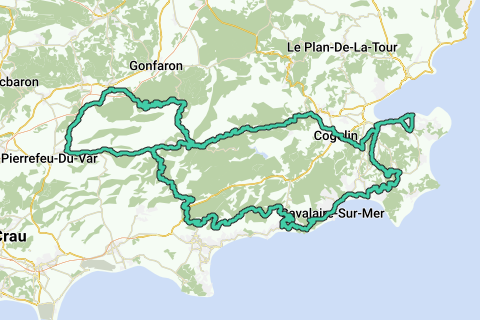 Einige Kilometer entlang des Mittelmeers in Richtung Osten, teilweise auf einem Radweg. Kurz vor Cogolin Plage geht es nach links, dann in Richtung Cogolin. Unterwegs haben wir schon einen ersten kurzen, aber steilen Anstieg. Durch Cogolin, eine schöne Stadt, um schließlich den mehr als 12 km langen Anstieg zum "Col de Taillude" zu beginnen, gefolgt von der Abfahrt nach Collobrières. Hier solltest du dir einen Vorrat anlegen.