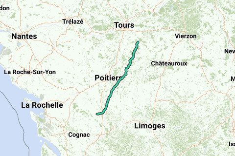 Du startest mit dem Anstieg aus dem Tal von 'l’Indre'. Es geht ein wenig auf und ab auf einem Plateau, bevor es ins Tal von 'l’Aulnaie' hinuntergeht. In la Roche-Posay, nach 47 km, überquerst du 'l’Aulnaie', die die Grenze zwischen der Region Centre-Val de Loire, Departement Indre-et-Loire, und der Region Aquitaine-Limousin-Poitoux-Charente, Departement Vienne, bildet. Den Rest der Reise in Frankreich fährst du durch diese große Region entlang der Atlantiküste.