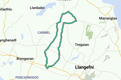 Beginnt am Rastplatz an der alten A5, fährt nach Norden in Richtung Llanerchymedd über Coedana und kehrt zum Ausgangspunkt zurück. 18 Meilen
