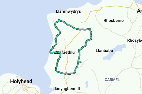 Beginnt am Llynnon Mill (parken Sie einfach außerhalb, wenn Sie planen, nach der Verriegelung des Parkplatzes der Mühle zurückzukehren), über Llanfflewyn, Llyn Llygeirian, Llanfairynghornwy, Borthwen und Llanfwrog zurück zum Llynnon Mill. Geht in die Nähe der Church Bay und berührt die Küste ein paar Mal. Am besten im Uhrzeigersinn, um den steilen Hügel entlang der Route hinunterzugehen. 19 Meilen