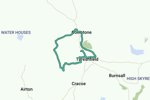 Mountainbike-Route. Start am Campingplatz des Caravanclubs, etwa 1 km nördlich von Threshfield auf der B 6160. Schöne Tour durch die North Yorkshire Dales, entlang kleiner asphaltierter Straßen und größtenteils entlang öffentlicher Reitwege. Schöne Ausblicke.