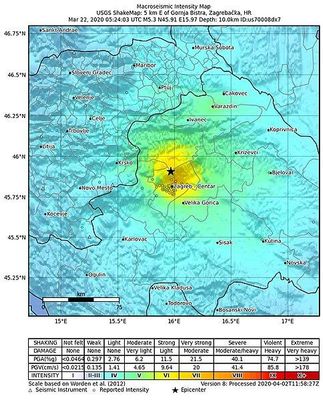 Am 22. März 2020 um 6:24 Uhr Ortszeit ereignete sich ein Erdbeben bei Zagreb. Es hatte eine Magnitude von 5,4 Mw auf der Momenten-Magnituden-Skala. Das Epizentrum des Erdbebens lag wenige Kilometer nördlich der kroatischen Hauptstadt Zagreb, in der es vor allem in der Altstadt zu schweren Schäden kam. Ein 15-jähriges Mädchen ist seinen Verletzungen erlegen, 17 weitere Menschen wurden schwer verletzt.