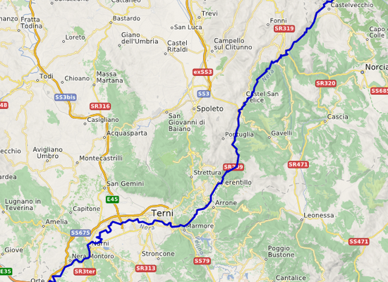 Die Quellen der Nera liegen bei Castelsantangelo sul Nera und Visso am Monte Porche in der Provinz Macerata, Marken. Bei Triponzo tritt der Fluss auf umbrisches Gebiet und verläuft in südwestlicher Richtung durch die Provinzen Perugia und Terni. Ein Teil des Wassers wird von Triponzo aus durch einen 42 km langen Kanal in den Lago di Piediluco geführt. Der obere Teil des Flusstals bildet das Gebiet Valnerina.
