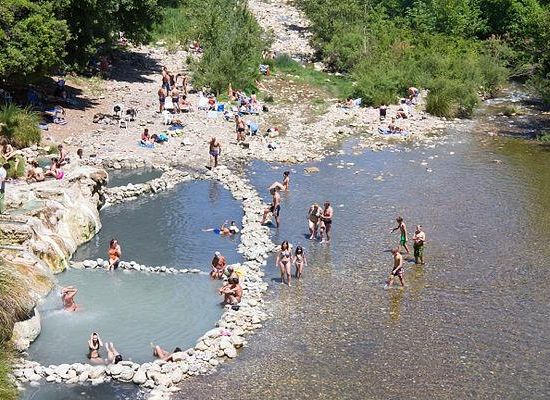 Der Ort, teils auch Terme di Petriolo genannt, liegt 12 km südöstlich des Hauptortes Monticiano, 26 km südlich der Provinzhauptstadt Siena und 77 km südlich der Regionshauptstadt Florenz. Der Ortsname stammt im ersten Teil vom italienischen Wort für Thermalbäder ab, der Ortszusatz Petriolo entstammt der anliegenden Burg Castello di Petriolo. Der Ort liegt am Fluss Farma an der Provinzgrenze zur Provinz Grosseto und der Gemeinde Civitella Paganico in der Landschaft des Mersetals bei 161 m s.l.m.