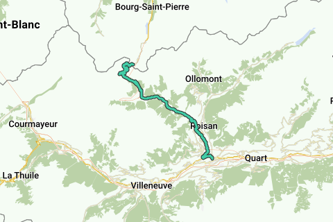 Steigen Sie von Aosta zum Col du Grand Saint Bernard auf. Sie erreichen eine Höhe von 2469 m nach einem Aufstieg von fast 35 km. Der Höhenunterschied zum Ausgangspunkt beträgt 1878 m. Die durchschnittliche Steigung beträgt 6 % und die maximale Steigung 9 %. Der Pass ist im Winter geschlossen (von Juni bis September geöffnet).