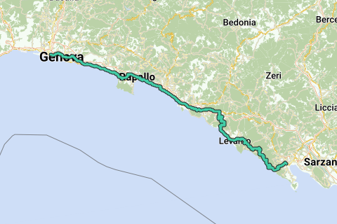 Pelgrimroute für Rennräder zwischen La Spezia und Genua. Die folgenden Städte liegen an der Route: La Spezia, Sestri, Rapallo und Genua.