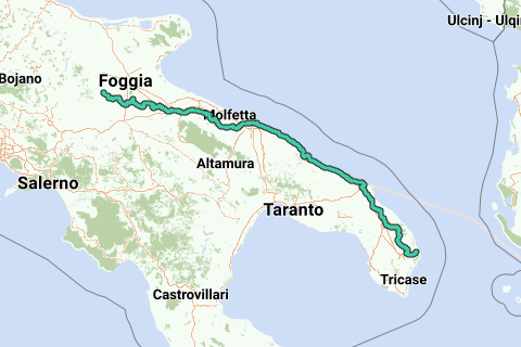 Pelgrimroute für Mountainbikes zwischen Otranto und Troia. Die folgenden Städte liegen auf der Route: Otranto, Lecce, Brindisi, Monopoli, Bari, Barletta und Troia. Diese Route ist Teil der "Via Francigena".