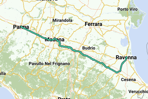 Pelgrimroute für Rennräder zwischen Ravenna und Parma. Die folgenden Städte liegen auf der Route: Ravenna, Forli, Bologna, Modena und Parma. Diese Route ist Teil der "Emilia Romagna".