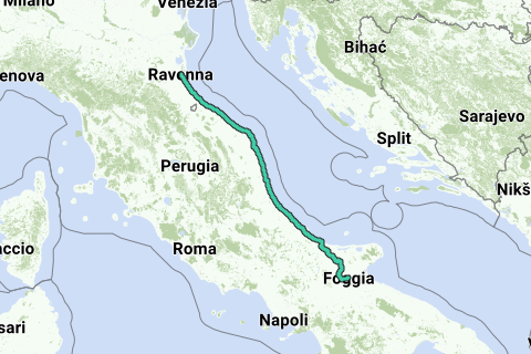 Pelgrimroute für Rennräder zwischen Foggia und Ravenna. Die folgenden Städte liegen auf der Route: Foggia, Termoli, Ortona, Pescara, San Benedetto, Osimo, Ancona, Rimini und Ravenna.