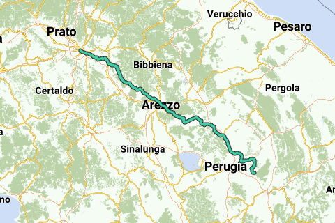 Route zu Ehren des Radfahrers Gino Bartali. Gino Bartali hat Respekt für seine Arbeit erworben, in der er Juden half, die von den Nazis während der Zeit der Italienischen Sozialrepublik verfolgt wurden. Bartali nutzte seinen Ruhm, um Nachrichten und Dokumente an die italienische Widerstandsbewegung zu überbringen. Bartali radelte von Florenz durch die Toskana, Umbrien und die Marken, manchmal sogar bis nach Rom, und trug dabei stets das Renntrikot, das mit seinem Namen versehen war. Weder die faschistische Polizei noch die deutschen Truppen riskierten Unmut, indem sie ihn festnahmen. Eine seiner Routen führte von Florenz nach Assisi. Dies ist nicht die genaue Route, sondern eine mögliche Route (oder Teile davon), die er nahm (Quelleninfo Wikipedia). Die Route wurde für alle ihre Teile mit Google Streetview verifiziert, um die Qualität der Oberfläche (asphaltiert) zu überprüfen.