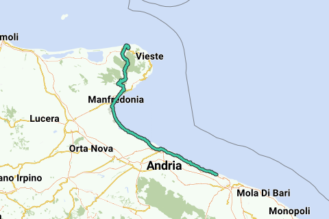 Von Agriturismo Torre dei Preti in Peschici, Apulien, Italien zum Strandhotel Riva del Sole an der Via Bari in 70127 Giovinazzo, Apulien, Italien.