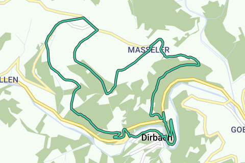 Start ist am kleinen Wanderparkplatz an der N27 zwischen Goebelsmühle und Dirbach. Wir gehen zuerst hinunter zur Sauer, überqueren diese am Hotel in Dirbach und gehen weiter durch die Ortschaft. Kurz vor der Hauptstraße krabbeln wir wortwörtlich den Hang hinauf, überqueren die N27 und folgen dann einem schönen Waldweg hinauf nach Masseler, oder in diesem Fall eben „Harderbaach“. Am Dreieck in der Mitte der 3 Ortsteilen gehen wir nach rechts die Straße entlang, dann nochmal nach rechts auf einen Feldweg dem wir bis nach „Masseler Knupp“ folgen. Genießen Sie die schönen Aussichten ins Sauertal! Jetzt geht es durch den Wald hinunter, die letzten Kilometer, zum Start zurück.