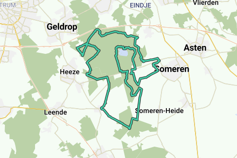 Nach einem Kilometer fährst du in die Wälder in Richtung Sterksel über teilweise unbefestigte Straßen und später in Richtung Naturschutzgebiet De Vrolijke Jager. Über unbefestigte Straßen und Radwege fährst du entlang der Vroolijke Jager. Danach fährst du über asphaltierte Straßen zum Naturschutzgebiet Keelven (Somerensche Heide). Über größtenteils befestigte Radwege fährst du um das Keelveen herum (von der anderen Seite als zu Beginn der Route). Sehr kurz folgst du dem Betonradweg entlang der Straße Heeze - Someren, um dann wieder in die Strabrechtse Heide einzutauchen über zunächst unbefestigte Straßen (die etwas mehr Sand als Schotter haben) und später Schotterradwege. Du fährst entlang des größten Weihers der Niederlande (dem Beuven). Die letzte Kilometer führt über befestigte Straßen zurück zum Ausgangspunkt.