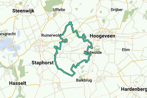 Die Route führt durch das Boswachterij Staphorst und verläuft weiter entlang von De Wijk, Rogat und führt dort ein Stück entlang der Hoogeveensche Vaart.