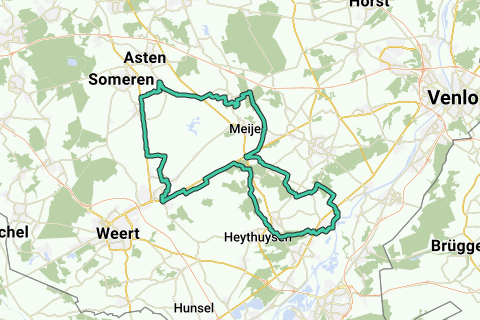 Über befestigte Straßen fährst du nach Neer, wo der Pausenplatz am Boothuis de Troost ist. Nach diesem Pausenplatz geht es sofort bergauf, um an den steilen Ufer entlang des Flusses Maas zu gelangen, von wo aus du eine wunderschöne Aussicht über die Maas hast. Über einen teilweise unbefestigten Radweg entlang des Entwässerungskanals durch die Mussenberg fährst du in Richtung Meijel. Nun folgen längere Abschnitte unbefestigter Straßen, durch das Naturschutzgebiet Bovensbos und Keuperheide, entlang des Naturschutzgebiets Brookberg, durch das Naturschutzgebiet Waterbloem, entlang des Entwässerungskanals und entlang des Kanals von Deurne (die Waldabschnitte entlang des Kanals von Deurne bilden einen Naturkorridor in der Landschaft).