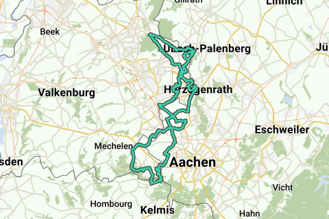 Rundfahrt Heuvelland 40 von Vijlen. Start/Ziel: Boscafé 't Hijgend Hert, Rugweg, Vijlen. Anstiege: Pas van Wolfhaag Vaals 1.900 m., max. 10,0%. Rue les Trois Bornes Gemmenich (B) 2.200 m., max. 6,0% Schlangenweg Seffent (D) 900 m., max. 9,0%. Duivels Bosch Kerkrade 950 m., max. 14,0%. Haanraderweg Kerkrade 750 m., max. 9,0%. Lindegracht Rimburg 700 m., max. 8,0%. Molenweg Rimburg 500 m., max. 10,0%. Heikop Landgraaf 2.800 m., max. 5,0%. Korverberg Eygelshoven 800 m., max. 9,0%. Mont Gaia Kerkrade 1.200 m., max. 10,0%. Mamelisserweg/Vijlenberg/ Rugweg Vijlen 3.200 m., max. 8,0%. Höhenmeter: 990. Kaffeestopp: Brasserie 't Hert va Woabich, Kerkstraat 2b, Waubach (mo/di geschlossen).