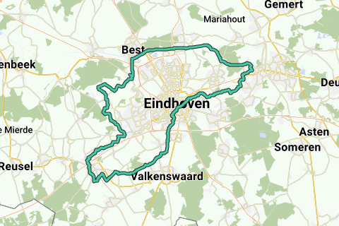 Von Helmond über Eindhoven nach Waalre. Die Route durch Eindhoven führt über die breitesten Fahrradwege mit nur wenigen Ampeln. Nach Waalre geht die Fahrt über Riethoven nach Eersel. Auf dem Marktplatz von Eersel gibt es verschiedene Gelegenheiten, etwas zu trinken. Rückweg über den Flughafen und den Kanal nach Helmond.