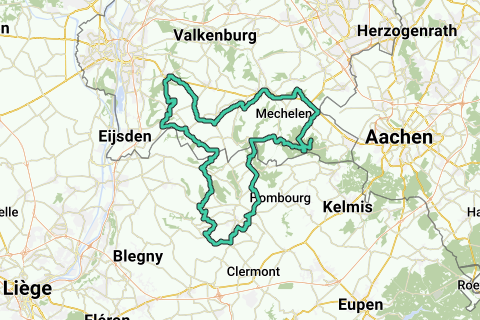 Rundfahrt Heuvelland 68 von Vijlen. Start/Ziel: Boscafé 't Hijgend Hert, Rugweg, Vijlen. Anstiege: Eperheide Epen 1.400 m, max. 8,0%. Smidt/Mabrouck Remersdaal (B) 3.000 m, max. 6,0%. Bois d'Ansy Aubel (B) 1.300 m, max. 6,0%. Kwinten/Op de Eiken St. Martens-Voeren (B) 1.800 m, max. 8,0%. Grenzheuvel Noorbeek 600 m, max. 13,0%. Bergstraat Banholt 750 m, max. 7,0%. Kruisberg Wahlwiller 600 m, max. 15,0%. Mamelisserweg Vijlen 1.200 m, max. 5,0%. Pannisberg Vijlen 2.000 m, max. 7,0%. Höhenmeter: 1.129. Kaffeestopp: Café d'r Pley, Pley 2, Noorbeek (mo/di geschlossen) oder Brasserie 't Maedje am Camping Grensheuvel Voerenstraat 11, Noorbeek (di/mi geschlossen)