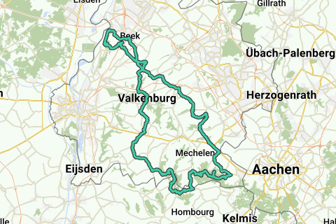 Rundfahrt Heuvelland 78 von Vijlen. Start/Ziel: Boscafé 't Hijgend Hert, Rugweg, Vijlen. Anstiege: Smidsberg Epen 1.500 m, max. 7,0 %. Gieveld Teuven (B) 1.500 m, max. 7,0 %. Piemert Slenaken 1.000 m, max. 12,0 %. Kleverberg Valkenburg 2.400 m, max. 8,0 %. Slingerberg Broekhoven 1.200 m, max. 7,0 %. Bronkweg Elkenrade 800 m, max. 10,0 %. Zwarte Brugweg Eys 950 m, max. 10,0 %. Mamelisserweg/Vijlenberg Vijlen 1.800 m, max. 5,0 %. Camerig oost Vaals 2.800 m, max. 12,0 %. Höhenmeter: 1.112. Kaffeestopp: Concon, Raadhuisstraat 77, Elsloo (mo/di geschlossen).