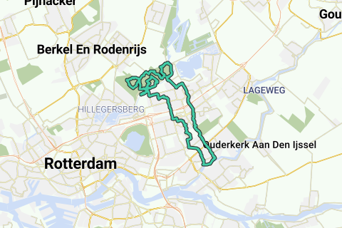 Route von Capelle Vuykpark zum Bergse Bos und zurück. Im Bergse Bos schöner Kurs durch alle Abschnitte hindurch. Von den Ski- und Mountainbike-Hügeln des Hoge Bergse Bos, entlang des Survival-Parcours und des Golfplatzes zum älteren Lage Bergse Bos mit den Teichen und Weihern, Liegewiesen und den Schottischen Hochländern. Zurück entlang der Rotte und den Parks in Ommoord.