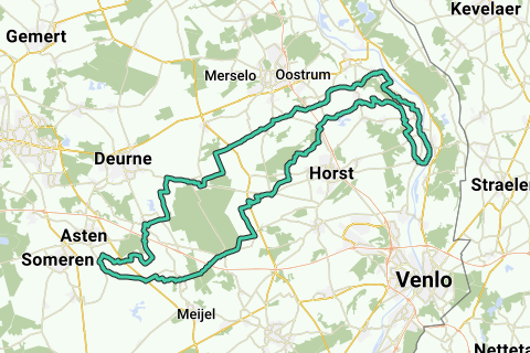 Nach Broekhuizen fährst du längere Zeit entlang der Maas in Richtung Lottum. Danach geht die Route in Richtung Swolgen und du fährst entlang des Südrandes des Naturschutzgebiets 't Sohr in Richtung Meerlo. Über Castenray fährst du entlang der Schadijkse Bossen nach America und dann nach Evertsoord über die Zwarte Plakweg, Helenaveen, Neerkant, um wieder in Heusden zu enden.