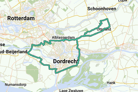 Clubfahrt der Hoekse Renners. Start/Ziel Klubhaus, Sportlaan 6, Puttershoek. Die Route führt über den Kiltunnel, die Wantijbrücke und die Merwedebrücke in die schöne Alblasserwaard. Nach dem Kaffeestopp folgt die Route ab Vuilendam entlang dem Fluss Alblas. Über die Brücke über die Noord und den Heinenoordtunnel wieder in die Hoekse Waard. Kaffeestopp im Restaurant 't Raadhuis, Goudriaan.