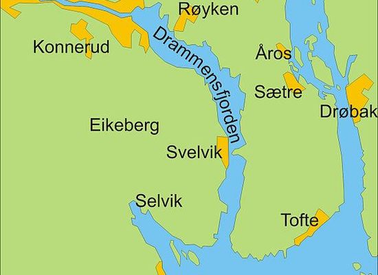 Auf der westlichen Seite liegen die Gemeinden Svelvik in Vestfold und Drammen, das zu Buskerud gehört; auf der Nordseite befindet sich der Ort Lierstranda, der Teil der Buskeruder Gemeinde Lier ist. Auf der östlichen Seite trennt die Halbinsel Hurumlandet mit den Buskeruder Gemeinden Hurum und Røyken den Drammensfjord vom Oslofjord.