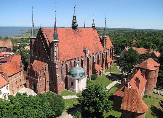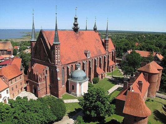 Die Kathedrale Mariä Himmelfahrt und St. Andreas oder Frauenburger Dom ist eine Kirche in Frombork und die Kathedrale des Erzbischofs von Ermland sowie Basilica minor. Sie beherbergt das Grab des Nikolaus Kopernikus.Nachdem die ermländische Wirtschaft nach den Wirren der Eroberungszeit bis 1280 sich schnell stabilisierte und wuchs, begann das Domkapitel im 14. Jahrhundert mit dem Bau einer festen Burg und des Domes selbst. Der Frauenburger Dom Mariä Himmelfahrt und St. Andreas, nach einem einheitlichen Plan von 1329 bis 1388 errichtet, ist als 99 m lange Hallenkirche architektonisch im weitgehend ursprünglichen Zustand erhalten.