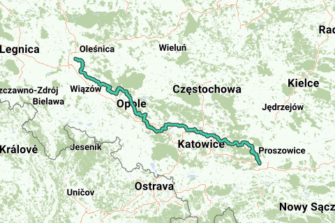 Pilgerroute für Rennräder zwischen Krakau und Breslau. Die folgenden Städte liegen auf der Route: Krakau, Olkusz, Dąbrowa Górnicza, Opole, Brzeg und Breslau.