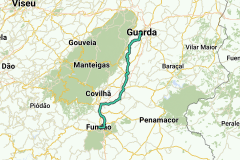 Wunderschöne Route durch ländliches Gebiet. Nach Belmonte muss bereits ein wenig geklettert werden, aber danach geht es wirklich bergauf mit einem Anstieg von etwa 400 m ab Gonçalo. Der Endpunkt des Tages, Guarda, ist mit 1000 m Höhe die höchstgelegene Stadt Portugals.