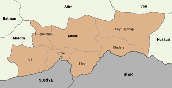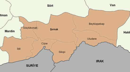 Şırnak ist eine Provinz der Türkei im Dreiländereck mit Irak und Syrien. Die Hauptstadt heißt ebenfalls Şırnak. Die Provinz grenzt im Norden an Siirt und Van, im Osten an Hakkâri und im Westen an Mardin. Sie hat eine Fläche von 7078 km² und ist im Durchschnitt 1400 m hoch. Die Provinz entstand durch Abspaltung von der Provinz Siirt im Mai 1990 . Neben der Hauptstadt Şırnak gibt es noch weitere 18 Gemeinden und 194 Dörfer.