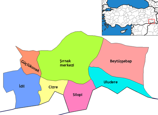 Der Landkreis İdil grenzt im Westen an die Provinz Mardin. Er besteht neben der Kreisstadt aus zwei weitere Gemeinden : Karalar und Sırtköy sowie 63 Dörfer , von denen 13 sogar mehr als 1000 Einwohner haben. Pinarbaşi , Oyali und Tekeköy sind davon die größten. Im Durchschnitt leben 667 Menschen in jedem der 63 Dörfer.