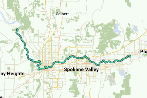 Der Spokane River Centennial Trail ist ein 37 Meilen (60 km) langer asphaltierter Weg in Washington, der für alternative Verkehrsmittel und zur Freizeitnutzung genutzt wird. Er erstreckt sich von Sontag Park in Nine Mile Falls, Washington, bis zur Grenze zwischen Washington und Idaho. Er führt durch die Städte Spokane, Washington, Spokane Valley, Washington, und Liberty Lake, Washington, und ist in drei Abschnitte unterteilt. Riverside bezieht sich auf den Abschnitt des Weges innerhalb des Riverside State Parks, Urban bezieht sich auf den Abschnitt innerhalb der Stadt Spokane, und Valley bezieht sich auf den Abschnitt Spokane Valley westlich der Grenze. Nach der Grenze nach Idaho setzt sich der Weg als North Idaho Centennial Trail fort.