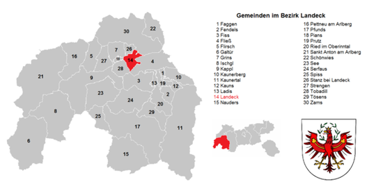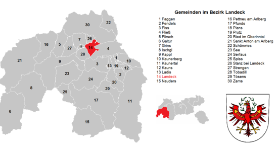 The Bezirk Landeck is an administrative district in Tyrol, Austria. It borders the district Reutte in the north, the district Imst in the east, South Tyrol and Graubünden in the south, and the district Bludenz in the west.The area of the district is 1,595 km². The population is 43,886 , with a population density of 28 persons per km². The administrative center is Landeck.